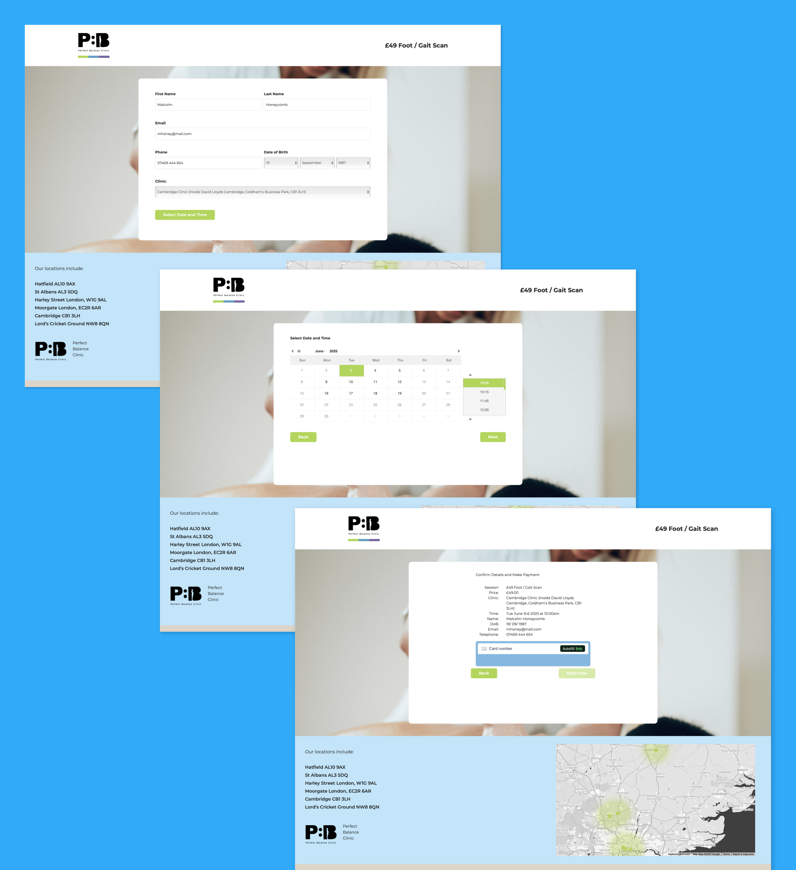 The form captures the client’s name and desired service on the first screen. It then checks availability through the Nookal API, displaying available time slots based on the practitioner’s schedule.